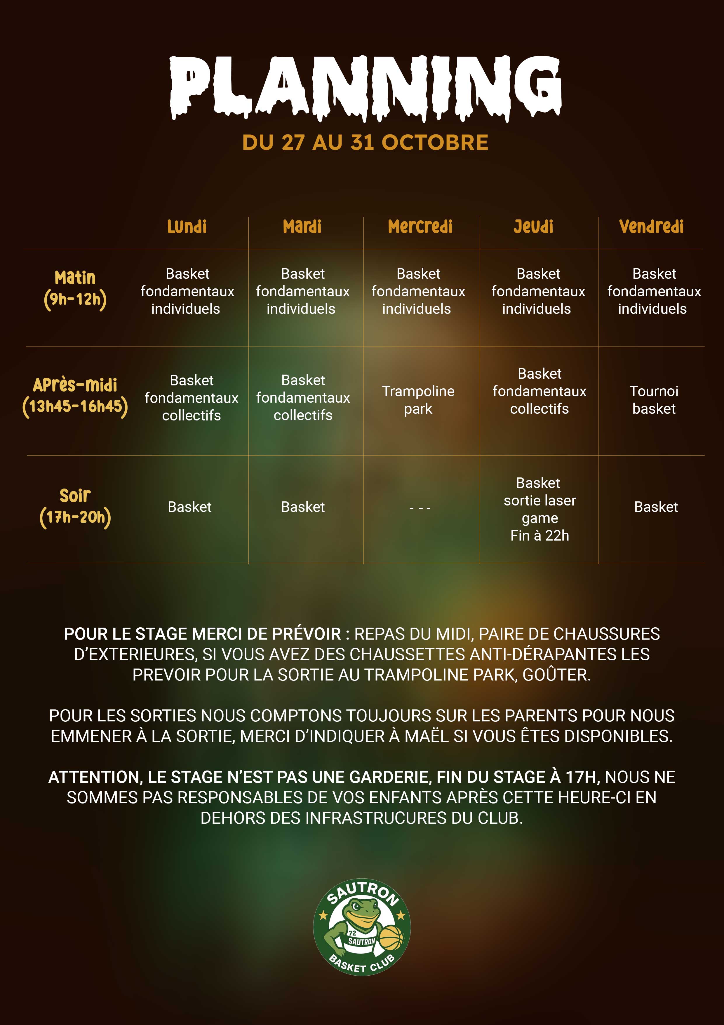 Chers inscrits nous vous convions au stage de basket d'halloween qui aura lieu du 27 au 31 octobre 2025.