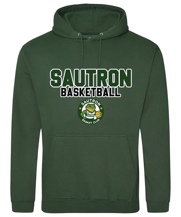 Sweat en coton basic Hoody, à capuche avec poche ventrale, taille adulte ou enfant, couleur : vert bouteille. Flocage Sautron Basketball et nouveau logo